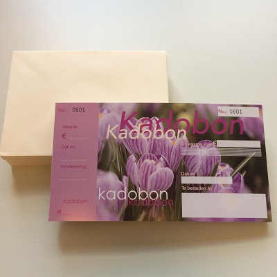 Cadeaubonnen bedrukt met crocus - voorjaar in full colour, genummerd. Verpakt per 50 stuks inclusief gele enveloppen. Afmeting Cadeaubon is breed 20 cm x hoog 11 cm. Afmeting gele enveloppe is 16x11,5 cm. Krokus. Kadobon. Afmeting welke de klant mee krijgt is 150x100mm. Afscheurstrook links voor de boekhouding registratie. Gedeelte rechts is dan voor de klant.