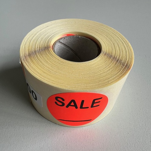 Etiket fluor rood 33mm - SALE met streep 500/rol, kleefkracht permanent. Kortingsetiketten, procentetiketten, afprijs-etiketten. FSC-C106281.