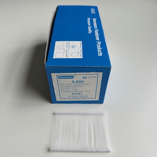 Dennison textielpins 65 mm fijn PP riddersporen verpakt per doosje met 5000 stuks. Nr. 03141 Zo lang de voorraad strekt.