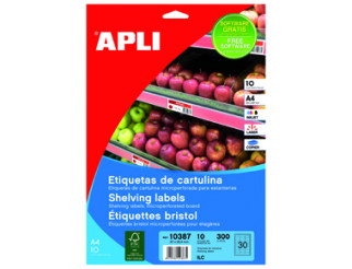 Apli-nr. 10387 Inkjet/laser/copier kartonnen schaplabel afmeting 25,4x67 mm, 30 labels per A4-vel, verpakt per 10 vellen. Dus 300 labels. 200 gr/m2. Schapkaartjes. Dit artikel is niet zelfklevend. Voorzien van perforatie tussen de labels.