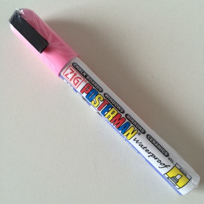 ZIG Posterman PMA-50 pink marker with a 2-6mm chisel tip. Solely to be used on a non-porous basis. Can be removed with a special remover and therefore cannot be removed with water or soap.