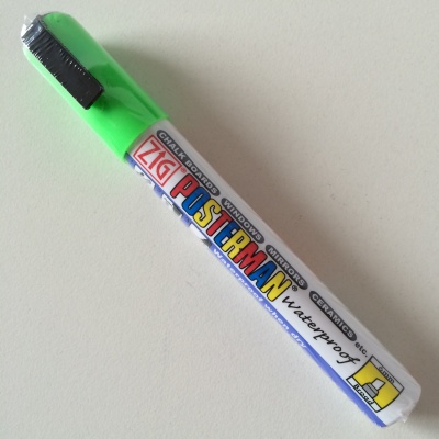 ZIG Posterman PMA-50 fluor green marker with a 2-6mm chisel tip. Solely to be used on a non-porous basis. Can be removed with a special remover and therefore cannot be removed with water or soap.