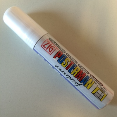 ZIG Posterman PMA-120 white marker with a 7-15mm wide chisel tip. Solely to be used on a non-porous basis. Can be removed with a special remover and therefore cannot be removed with water or soap.