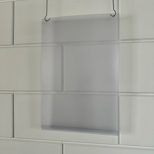 L-shaped acrylic display 105x148mm width x height vertical/portrait. A piece of paper can be slid in between the two layers of acrylic. Made in Holland.