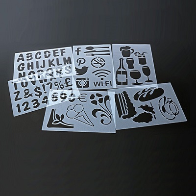 Template - set of 6pcs for working with chalk markers. Number and letter height 6cm. Figures 15-17cm high. Dimensions per template: 37x23,5cm. Letters and numbers, images, icecream, wine, coffee, chocolatemilk, glass, cake, grapes, bread, cutlery, smoking prohibited, wifi, facebook, pinterest, twitter, instagram.