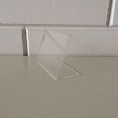 L-shaped acrylic display 105x74mm width x height horizontal. A piece of paper can be slid in between the two layers of acrylic. Made in Holland.