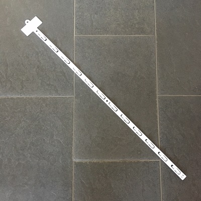 Hang-strip heavy duty met 12 clips, lengte 78cm, breedte 18mm. Hangstrip. Uitvoering met vast label, afmeting label 74x33mm Lengte: 74cm gemeten zonder label. Lengte met label 78,5 cm. Aantal clips: 12 Afstand clips: 60 mm