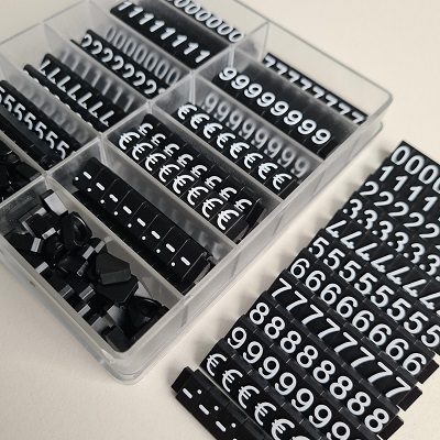 Prijscassette ETALAGE 10mm hoge prijsblokjes. Kleur zwart met witte cijfers. Hoogte van het blokje is 10mm x 5mm breed. (Totaal 400 stukjes) Inhoud 320 prijsblokjes met cijfers en tekens: 48x0, 24x1, 16x2, 16x3, 16x4, 24x5, 16x6, 16x7, 16x8, 48x9, 48x €-teken en 32x punt-streep .- 40 Blanco begin stukjes en 40 blanco eindstukjes. Deze gekleurde prijsblokjes hebben een “lego”-connectie aan de zijkant van het blokje. Past en klemt in elkaar.