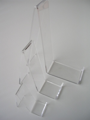 Acryl-standaard voor lederwaren/ mobiele telefoons hoogte 9cm vuldiepte 2,5cm, totale diepte 7cm en breedte 3,4cm.