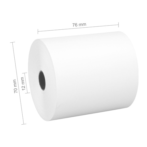Cash register / Printer roll 76x70x12 white wood free. Lenght of the roll is 46m. Price per roll. Box contains 50 rolls. Bisphenol safe (Bisfenol A) (BPA). Price per roll.