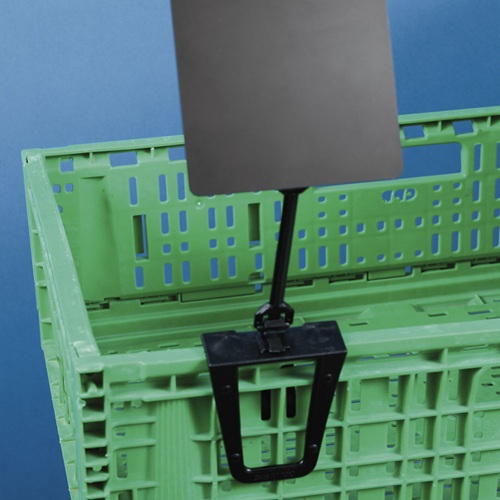 Kistklem zwart hoogte staafje 6cm en met adapter voor bevestiging aan Klick prijskassettes. (prijskassette/prijsraampje nog apart bij te bestellen) Klemt op veel kisten en kartonnen dozen.