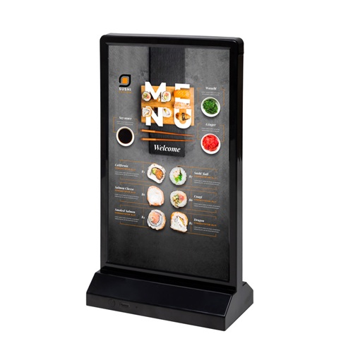 LED menu standaard 99x210mm zwarte uitvoering voor 9,9x21 cm papier. Voorzien van transparante folie, en met een lichtgevend display. Opladen via USB. Brandduur ongeveer 8 uren op een single charge. Afmeting 11,7x24x6cm. Papiermaat 99x210mm, zichtmaat 100x200mm. Lichtkleur 6000K, intensiteit 23 lux en wattage 1,5W.