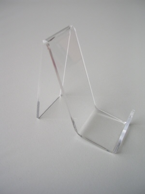 Acryl-standaard voor lederwaren/ mobiele telefoons hoogte 6cm vuldiepte 2cm, totale diepte 6cm en breedte 3cm.