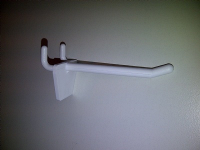 Boardhaak kunststof wit, met enkele pen, lengte 75mm, kleur wit hart op hart maat is 25mm. Nylon met glasfiber versterkt kunststof, geschikt voor gaatjes panelen met hart op hart afmeting 25mm. Fully recyclable.