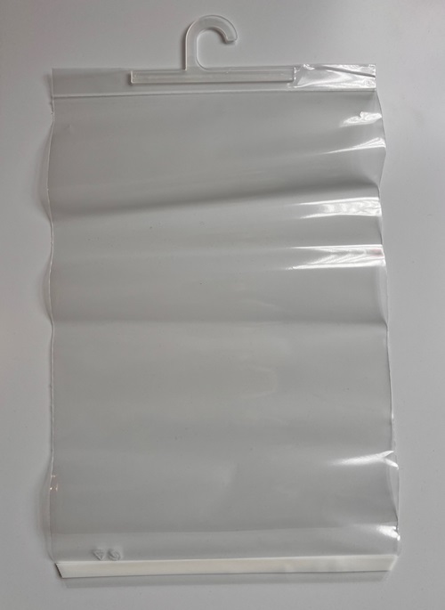 Zakken 23x33cm+6cm, PP (Polypropyleen) met kunststof haak en een lat met een breedte van 10cm, PP zakje afmeting 230x330mm, dikte materiaal is 50 micron voorzien van een zelfklevende sluiting. Verpakking per 750 stuks. Haakzakken.