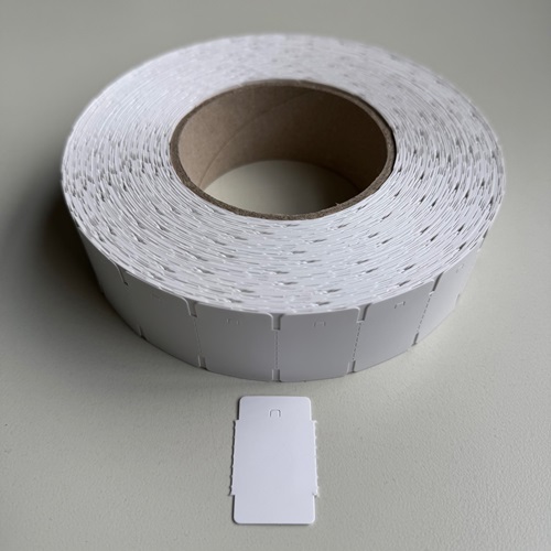 Hangetiket op rol afmeting 17x25mm zonder bedrukking, breed op rol, aantal 2.000 stuks per rol. Confectielabel, prijslabel. Prijskaartje, hanglabel, geschikt om met een textieltang en riddersporen/textielpins aan kleding te schieten. Tussen de hangkaartjes zit er altijd ook een perforatie.