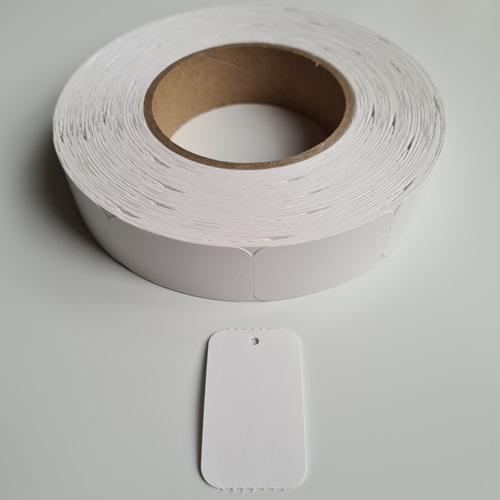 Hangetiket op rol 30x50 mm blanco onbedrukt 1.000 per rol, wel ponsgaatje, en wel horizontale perforatie in kaartje. Confectielabel, prijslabel. Prijskaartje, hanglabel, geschikt om met een textieltang en riddersporen/textielpins aan kleding te schieten. Tussen de hangkaartjes zit ook een perforatie. FSC®-C004451.