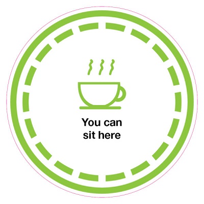 Pictogram sticker zelfklevend KLEIN, You can sit here, tafelsticker. Diameter 10cm achterkant zelfklevend. Corona, Covid_19. Indien niet voorradig, zal levertijd ongeveer 4 werkdagen zijn. De sticker worden geproduceerd op zogenaamde high-tack folie. Deze folie heeft een zeer hoge plakkracht waardoor onze stickers op bijna elk oppervlak goed plakken en voorzien van hoogwaardig glanslaminaat, door het gebruik van dit laminaat kunnen de stickers tegen een stootje en zit er bovendien een UV-filter in waardoor de kleuren van de stickers veel langer mooi blijven dan niet gelamineerde stickers.