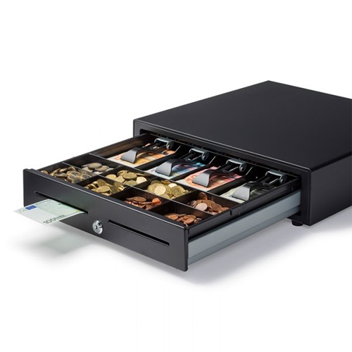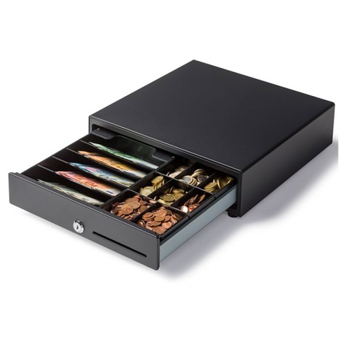 Cash drawer fliptop black 24V 1A, with 8 coin compartments and 5 bill compartments. Opening to top side, vertical bill compartments and space below the drawer insert. 460(W)x170(D)x100(H)mm. Removable drawer insert & protective top. Black - RJ-12 Epson-Star