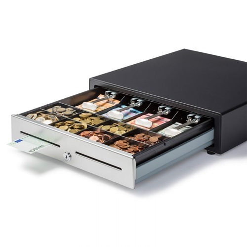 Cash drawer wide 8 coin compartments and 4 bill compartments with USB to connect the drawer to the computer. With ringing tone and RVS front. Dimensions: wxhxd 40,5x11,3x42,3cm.