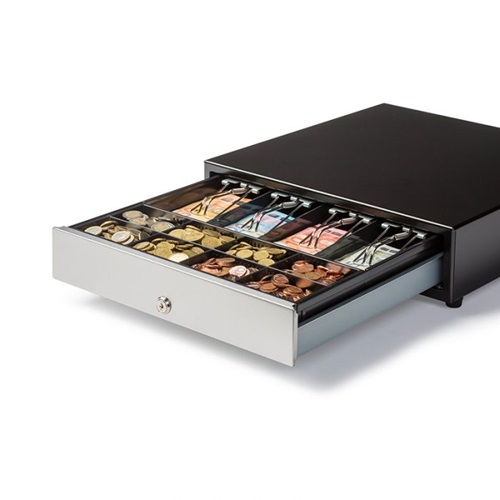 Budget cash drawer, wide model, with plastic drawer. Dimensions: 410 mm x 415 mm x 110 mm. Drawer insert with 8 coin compartments and 4 bill compartmens. Robust cash drawer with front touch opening.