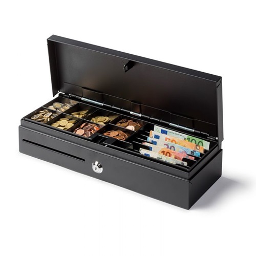 Cash drawer, small and deep, with fronttouch. Colour black. Layout with 8 coin compartments and 5 bill compartments. Lose coin compartments. The cash drawer is suitable for retail, clubs and non-profit organisations. The front touch opening makes it easy to open the drawer. In case of low stock, the delivery time will be 3-5 working days.