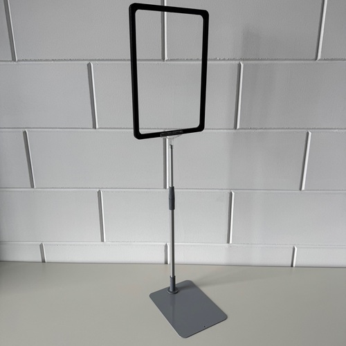 Poster frame stand A4 black with an adjustable tube and metal base plate. Adjustable from 32cm to 62cm. This is a composed product number for us, which consist out of 4 other product numbers. You can find the current stock of the 4 parts at the >related products< section.