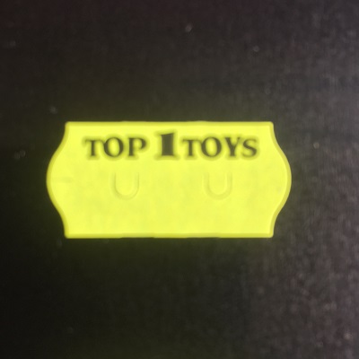 Labels 26x12 fluor yellow with black print: TOP 1 TOYS. Removable labels. Each box contains 36 rolls.
