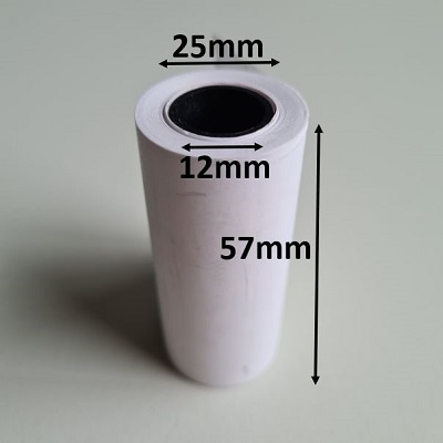 Thermal paper rolls 57x30x12mm white 55gram/m² - pin roll for the newest and smallest portable payment machines. Length of roll 10m. Price per roll. Box contains 50 rolls. For the Banksys and QE Smash payment machines and Pinlinq portable payment machine. Also fits the taximeters from: Hale thermoprinter TPD-01, Taxitronic IR32, Taximeter TX50.