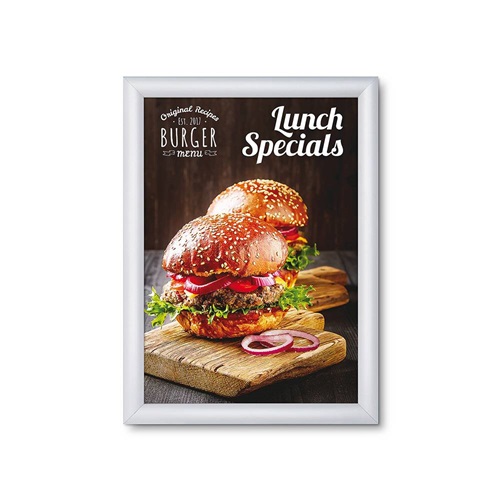 Klik-lijst SlimLine 42x59cm bxh TwinSnap, alleen de vertikale profielen hoeven te worden opengeklapt. Profielbreedte is 25 mm. Zo lang de voorraad strekt.