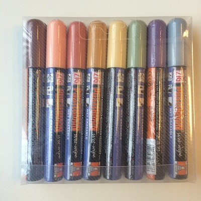 Chalkmarkers set 2-6mm consisting out of 8 classic coloured markers. Removable with water on a non-porous background. Chisel tip 2-6mm wide. Posterman WetWipe.